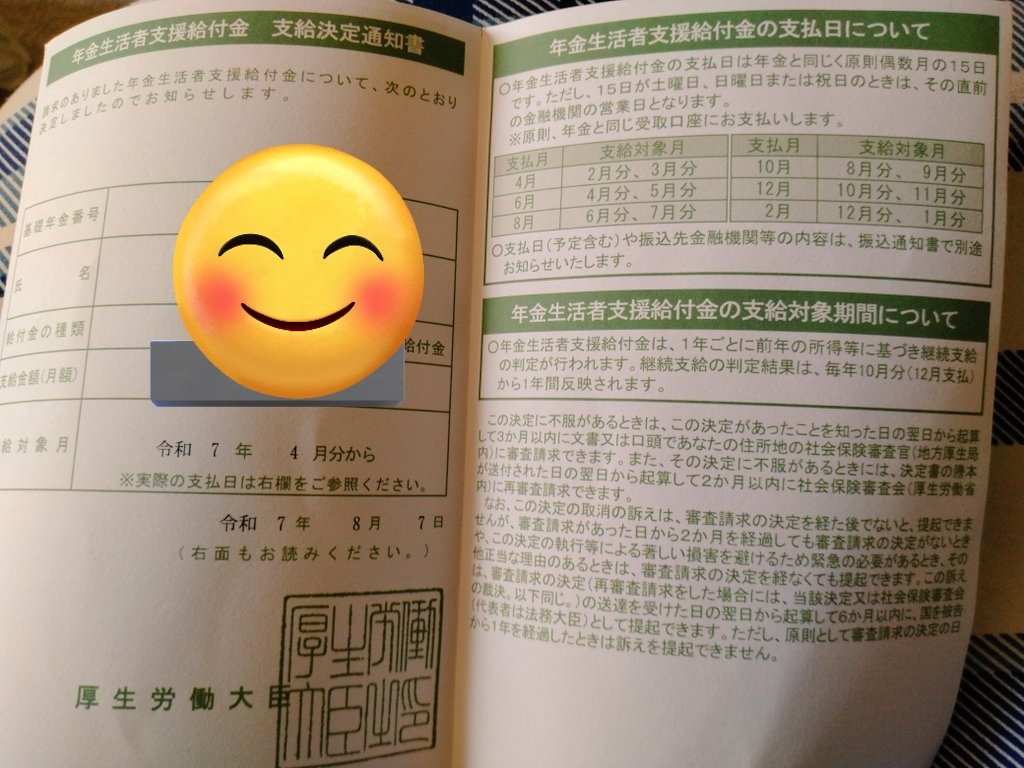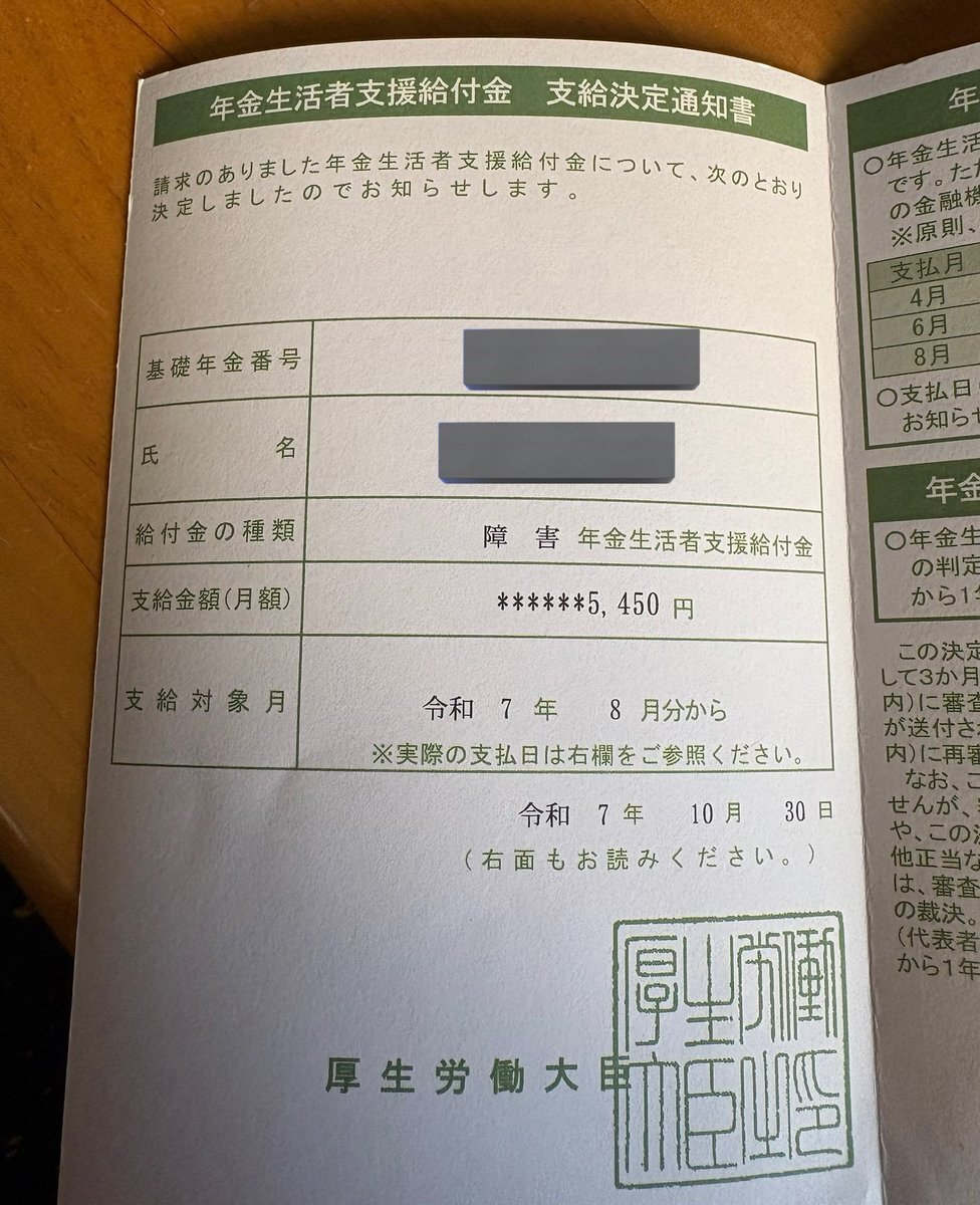 ようやく年金生活者支援給付金に関する通知が届きました。 障害年金と共に5月末に申請したので、翌月の今年6月まで遡求して頂けるようです。 障害年金の受給が決定したのは9月11日、支援給付金の受給が決定したのは10月30日のようなので、審査期間はおおよそ2ヶ月弱って感じですね。