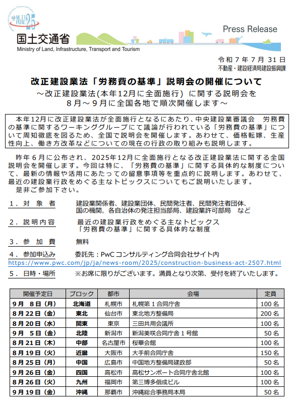 📌 国土交通省が主催する改正建設業法労務費の基準」に関する説明会が開催! 今年(2025年)12月から全面施行される改正建設業法について、8月〜9月にかけて全国各地で順次説明会が行われるそうです。 現場での適正な労務費の確保や法改正への理解を深めるチャンスです。 pic.x.com/eBgB0j1qKL