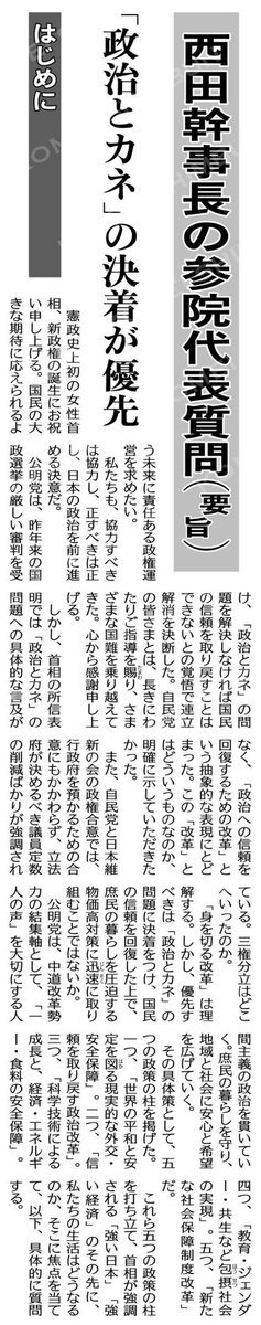 「企業・団体献金禁止を公約していた維新と連立を組みながら『企業献金は必要』などと言うのは自維双方とも二枚舌。『政治の信頼回復』が口先だけでないなら企業・団体献金を全面禁止すべき」。「命と暮らしを脅かす高市政権の姿勢追及/参院本会議 小池書記局長が代表質問」 jcp.or.jp/akahata/aik25/…