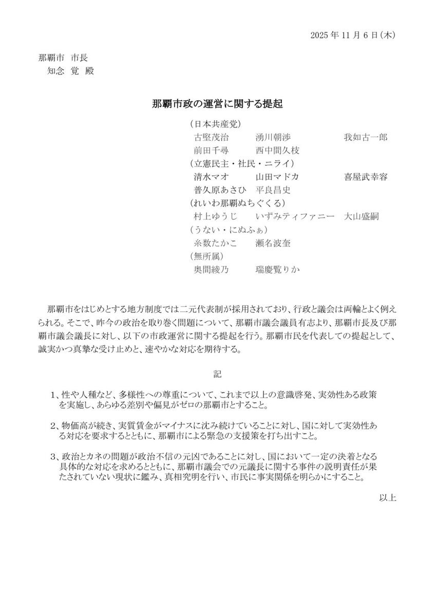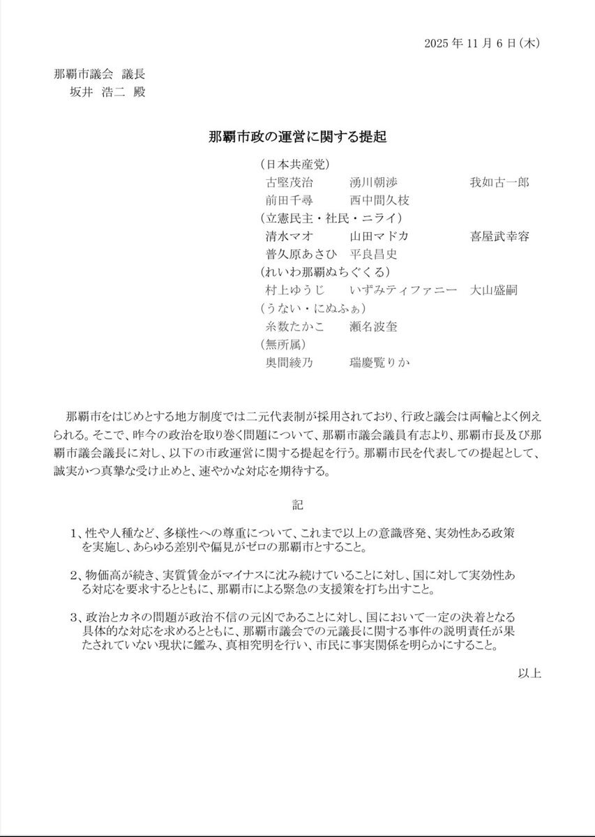 本日、那覇市長および議長に対し、市政運営に関する提起・要請を有志の会派議員行いました。 性や人種など多様性への尊重、物価高騰下での市民生活支援、そして政治の信頼回復。 どれも多くの市民の声が寄せられた重要な問題です。 速やかな対応を引き続き求めてまいります。 #那覇市議会 pic.x.com/cFe7UNuhdN
