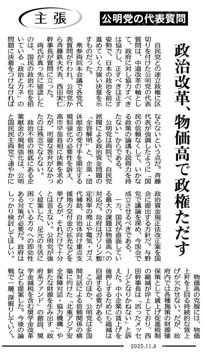政治の信頼回復・中小企業賃上げ・若者支援へ 公明党は現実的な解決策で日本を前へ #賃上げ #奨学金改革 #政治改革 (参院代表質問で西田幹事長)持続的賃上げ、中小にこそ/促進税制、縮減するな/政治とカネ、不記載問題解明は必須 #公明新聞電子版 2025年11月07日付 komei.or.jp/newspaper-app/ pic.x.com/u9hpCkjeF3