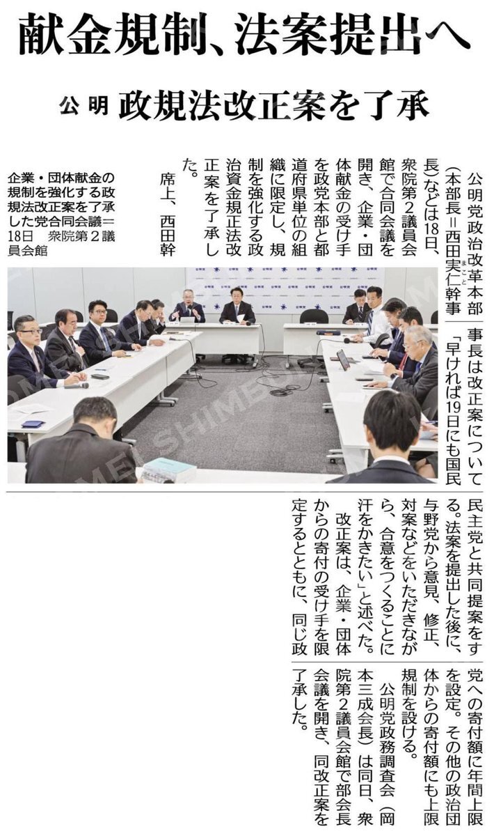 国民民主、公明両党は19日、企業団体献金の規制を強化する政治資金規正法改正案を衆院に共同提出した。献金の存続を前提に 透明性を向上させるとして、受け手を政党本部と都道府県単位の組織に限定する内容 ↑ 透明性を高め受け手を規制 反対する政党をよく見ておこう! x.com/47news_officia…