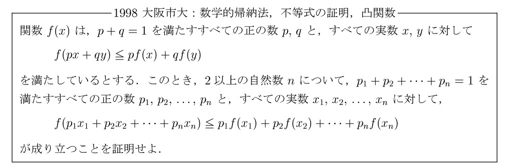 (続き)上記の簡明な証明は入試の題材にもなっている. 1980年(古い!)に秋田大で、次の設問付きで出題された. (1) a≧1,b≦1である任意の正の数a,bに対し, a+b≧1+ab となることを示せ. この機会に「平均に関する不等式を数学的帰納法で証明する」 有意義な入試問題を1つ紹介. pic.x.com/wkgsLA7BqY
