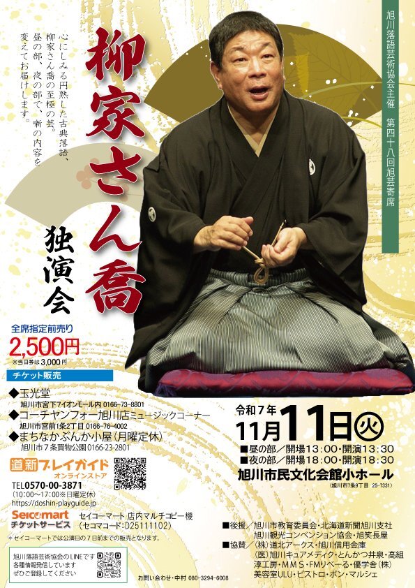 『柳家さん喬独演会』11月11日(火) 旭川市公会堂 昼の部・夜の部 チケット販売中です #落語 #寄席 #文化功労者 pic.x.com/9crpa9h8SR