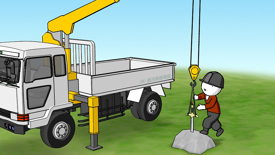 整地作業中に巨大な石に突き刺さった刀剣が発見されたため 作業者Aは急きょ刀剣を石から抜去して回収することを試みた。手元の工具で剣を引き抜こうとしたがびくともせず、そこでAは近くの取引先から借りた車載クレーン(吊り上げ荷重2.93t)で引き抜きを試みた。 この作業の不適切な点を述べよ。(10点)