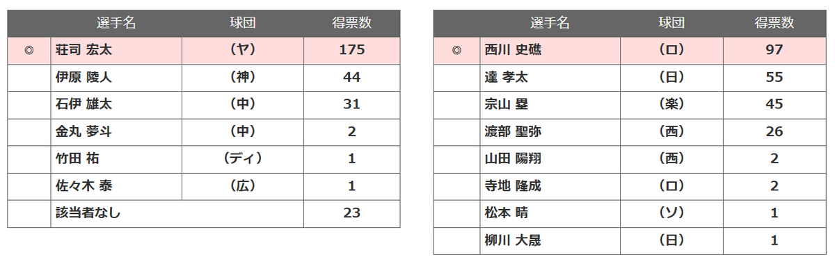 2025年プロ野球『新人王』の投票結果が公開される - ドラ要素@のもとけ dnomotoke.com/archives/20251… #dragons #中日ドラゴンズ 【セ・リーグ 新人王 投票結果】 荘司宏太(ヤ) 175 伊原陵人(神) 44 石伊雄太(中) 31 金丸夢斗(中) 2 竹田祐(ディ) 1 佐々木泰(広) 1 該当者なし 23 pic.x.com/BwGy8tWVmT