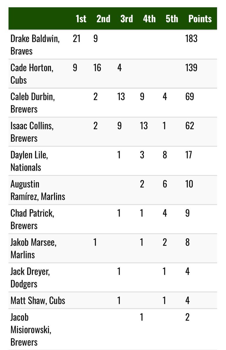 新人王投票結果(MIL) 3位 ダービン(3B) 4位 コリンズ(LF) 7位 パトリック(SP/RP) 11位 ミジオロウスキー(SP) 輝かしいルーキー達👏 pic.x.com/FRyHJRjEgp