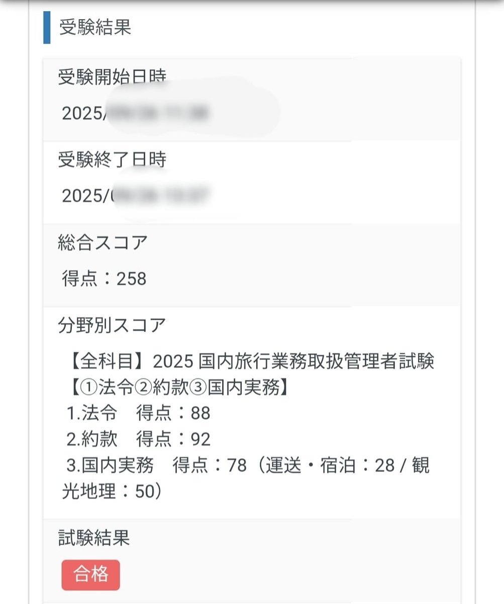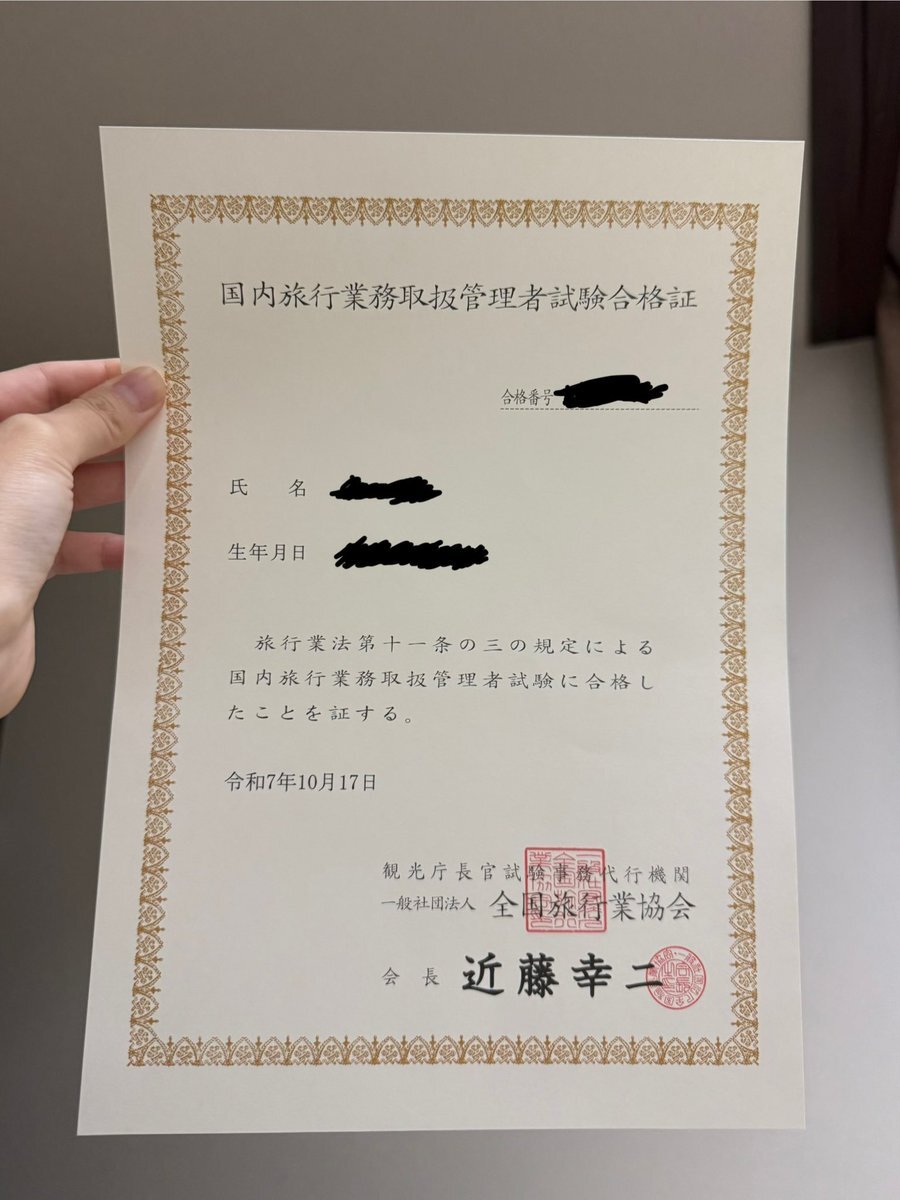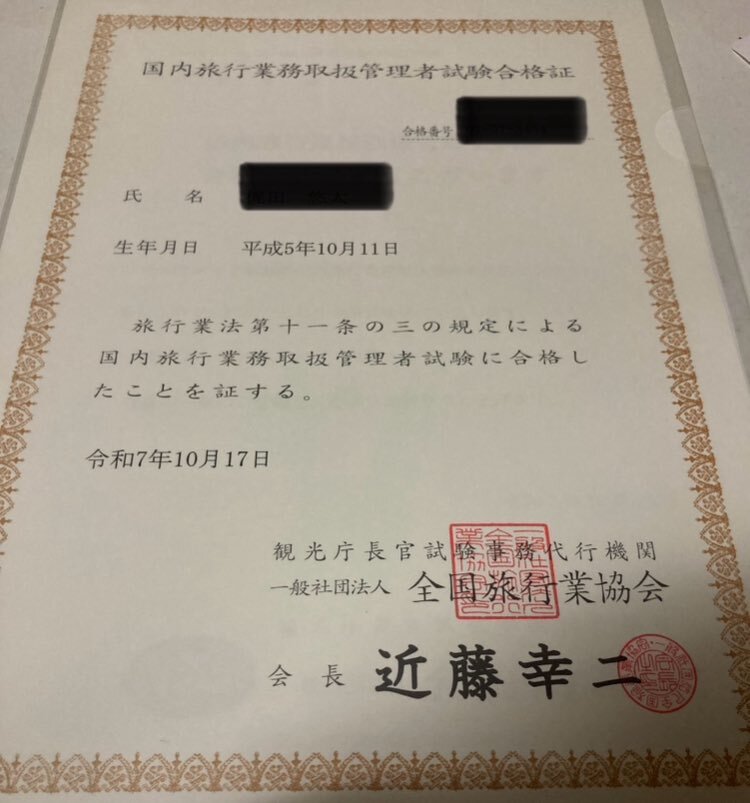 先々月に受けた国内旅行業務取扱管理者試験に合格してました😆 「趣味と被る」という極めて単純な理由で受けることを決めたのですが、間に合って良かった! 一昨年の宅建、昨年の行政書士に続き、3年連続の国家資格取得は自信になります😊 次はどうしよう? おすすめ資格があればコメントください🙇♂️ pic.x.com/ttmpuJm1OE