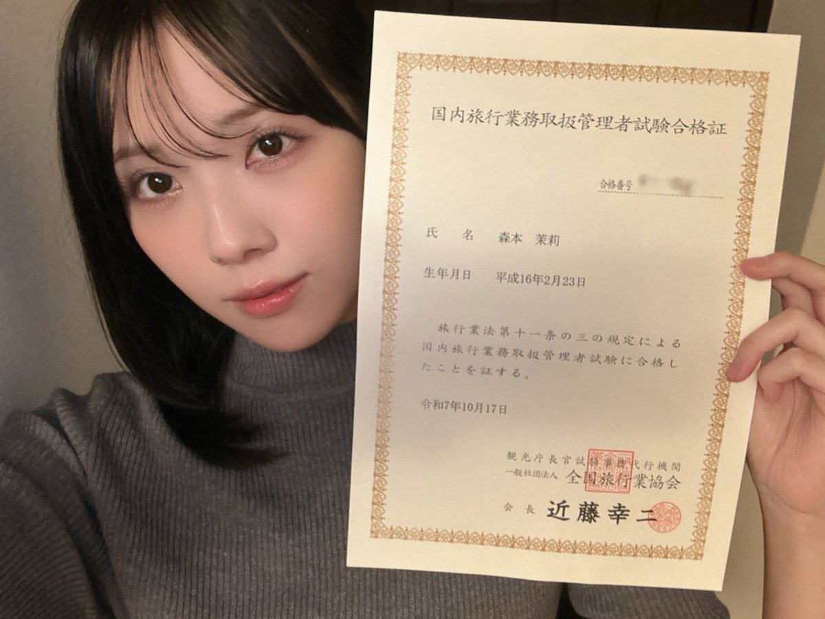 日向坂46の森本茉莉さんが国内旅行業務取扱管理者の国家資格に合格🎉 47都道府県制覇を目標に、海外ではオーストリア、チェコを訪れ自身のInstagramで写真や旅行記を掲載中 instagram.com/mariemorimoto_… 芸能の仕事を優先し総合の試験は受けられず。覚悟を持ってアイドルに向き合っています #森本茉莉 pic.x.com/e4B1WCgT7H