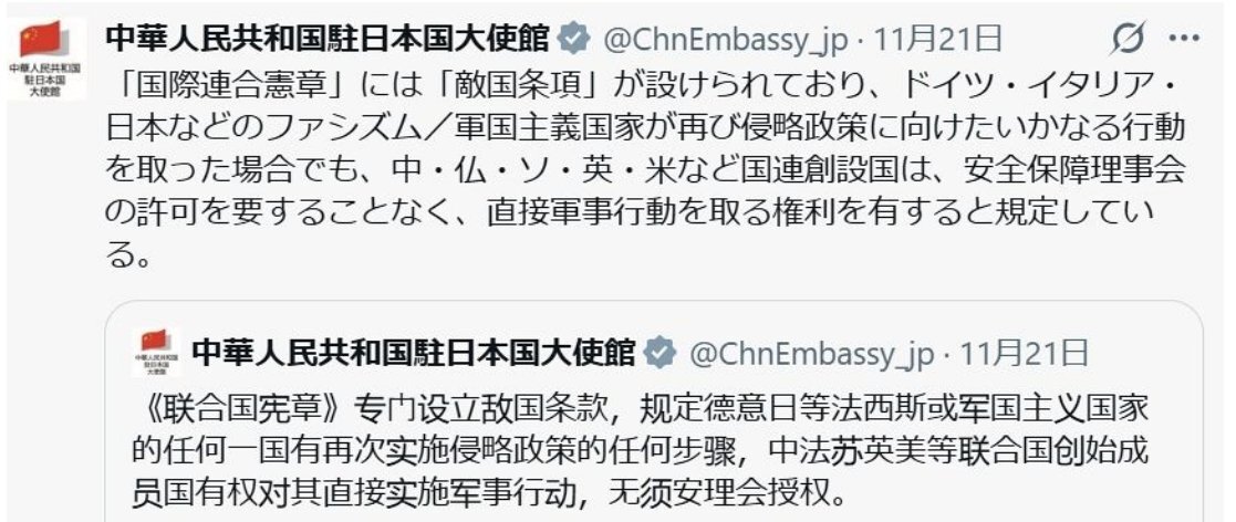 おととい?25/11/21 大使館がSNSポストしたらしい。 信じられないけど・・・?事実らしい。 フェイクじゃないよね? 「我々は安保理の許可なく日本を攻撃可能」と わざわざ投稿。 pic.x.com/So19S5brHd