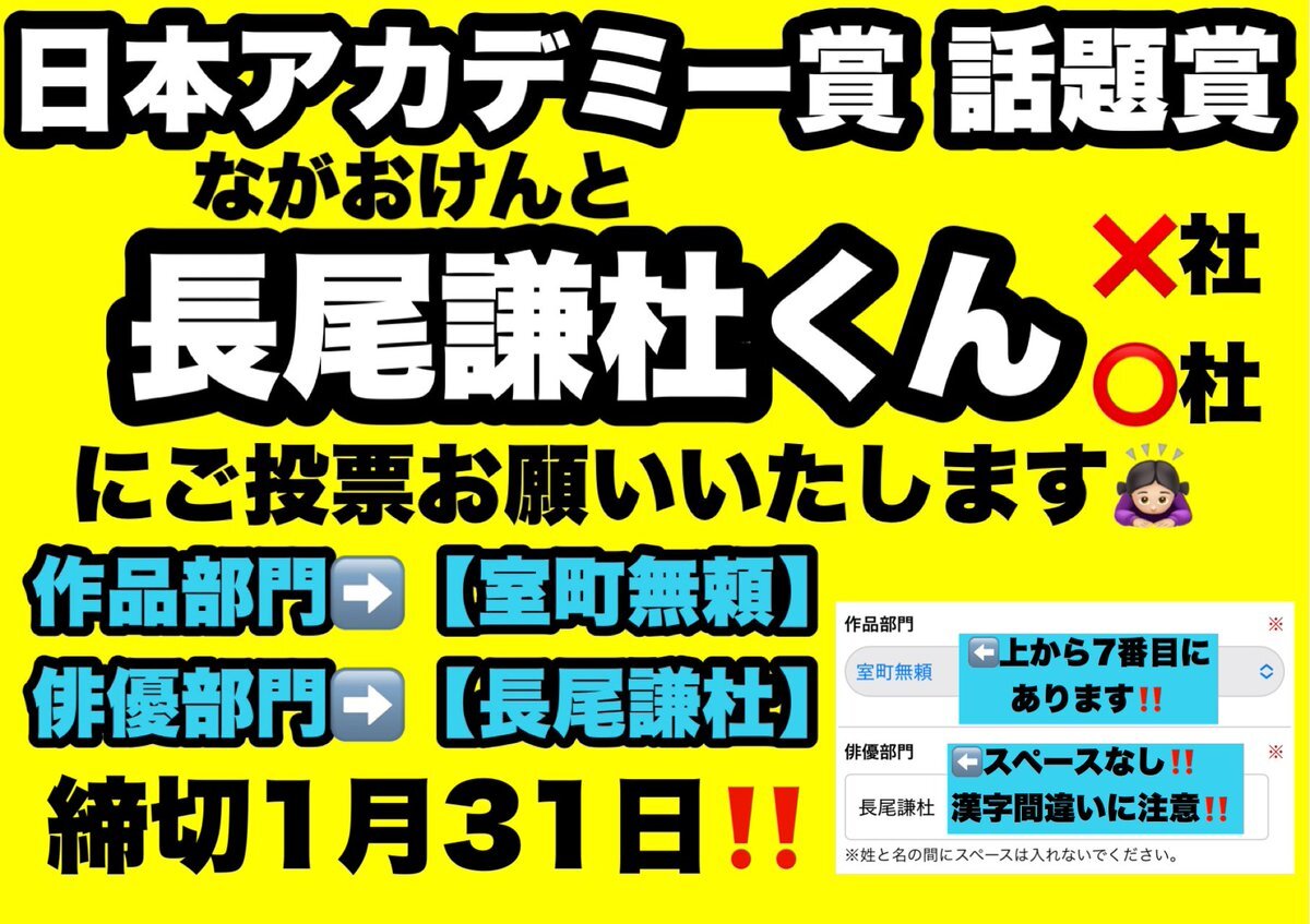 ✨🏆日本アカデミー賞 話題賞🏆✨ 🙏🏻投票の協力お願いいたします🙏🏻 【作品部門】▶️室町無頼 【俳優部門】▶️長尾謙杜 🔗 ssl.1242.com/aplform/form/a… 🗓1/31まで x.com/ann_since1967/…