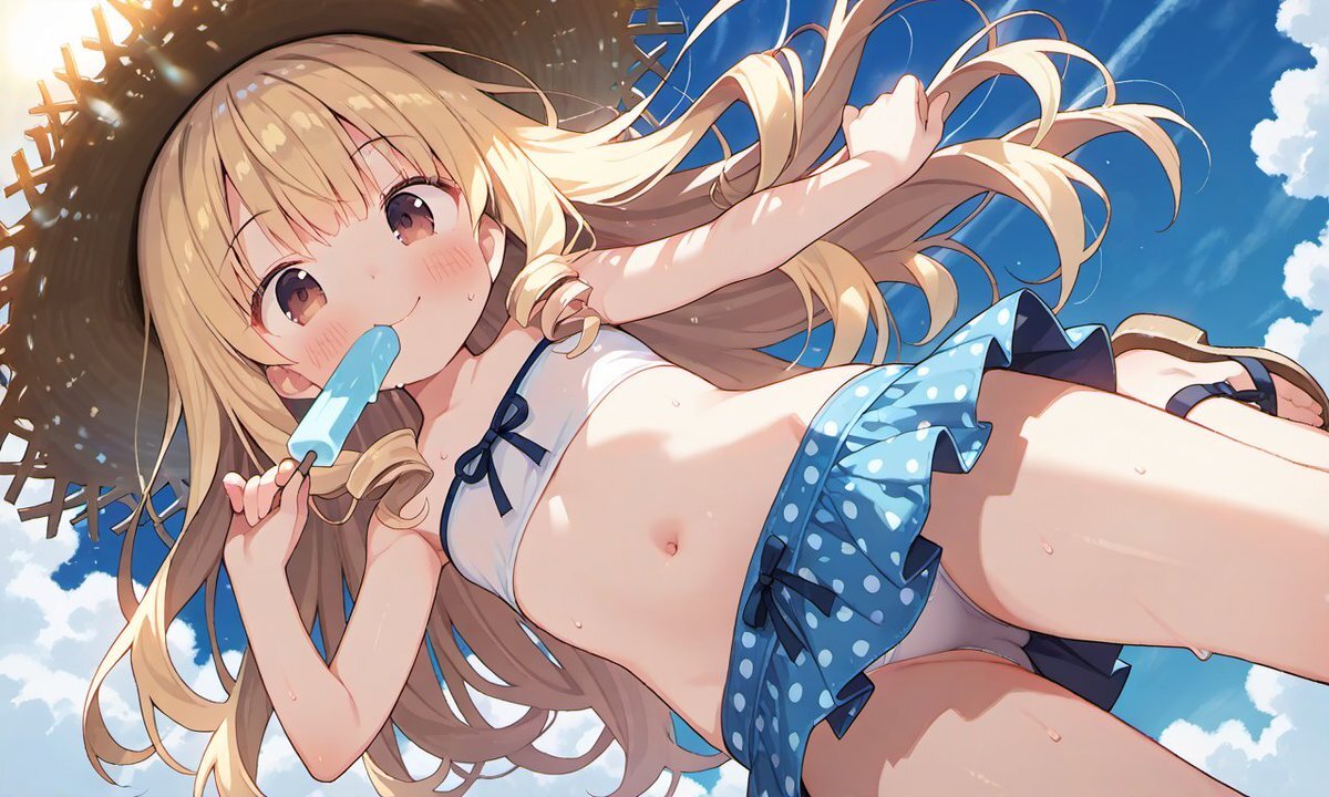 日本最高気温の日、真夏の日差しの下アイスキャンディーを食べている夏服衣装 tube top, mini skirt, sandals, straw hat, sweat, eating a popsicle in the midsummer sun, sunshine, blue sky。 天気予報によれば今日も暑いみたいのでお気をつけを。 #LemonSugarMix 2.0 noob #AIイラスト #PixAI pic.x.com/5KcQAigCxg