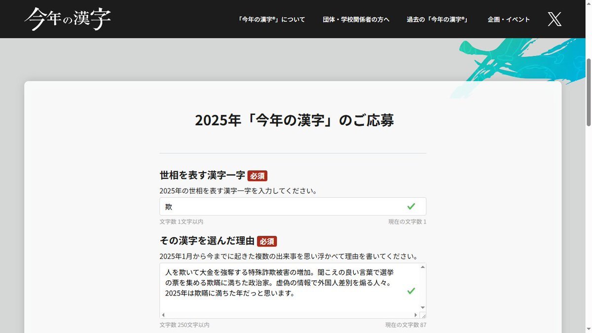 公益財団法人 日本漢字能力検定協会が「今年の漢字」を応募しているようなので、25年の憤懣をぶつけておいた。kanken.or.jp/kotoshinokanji…