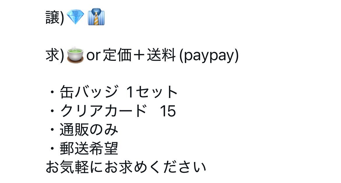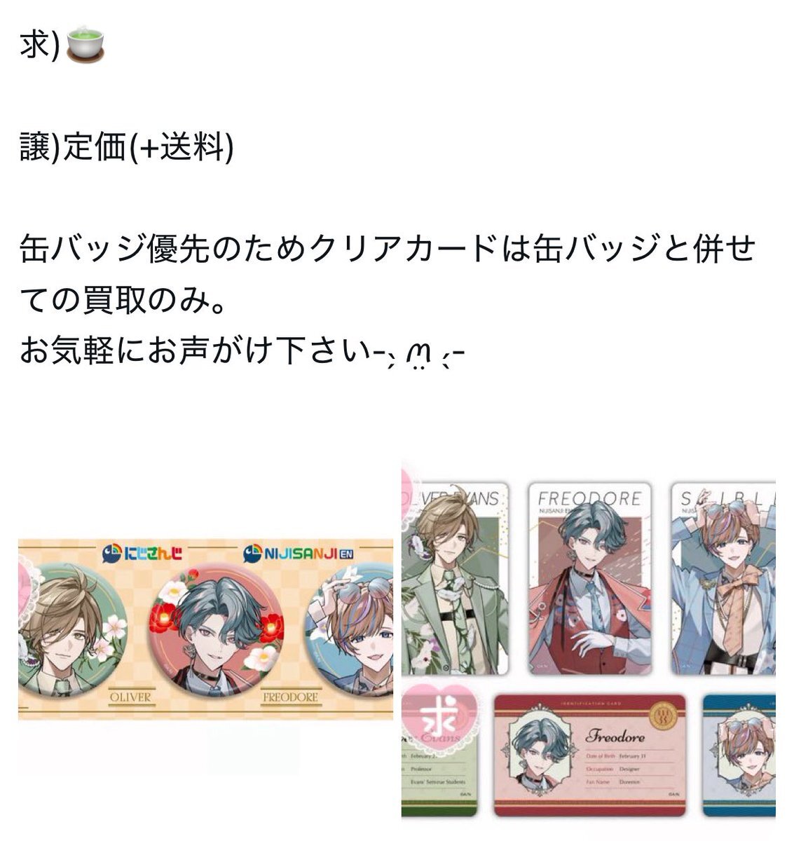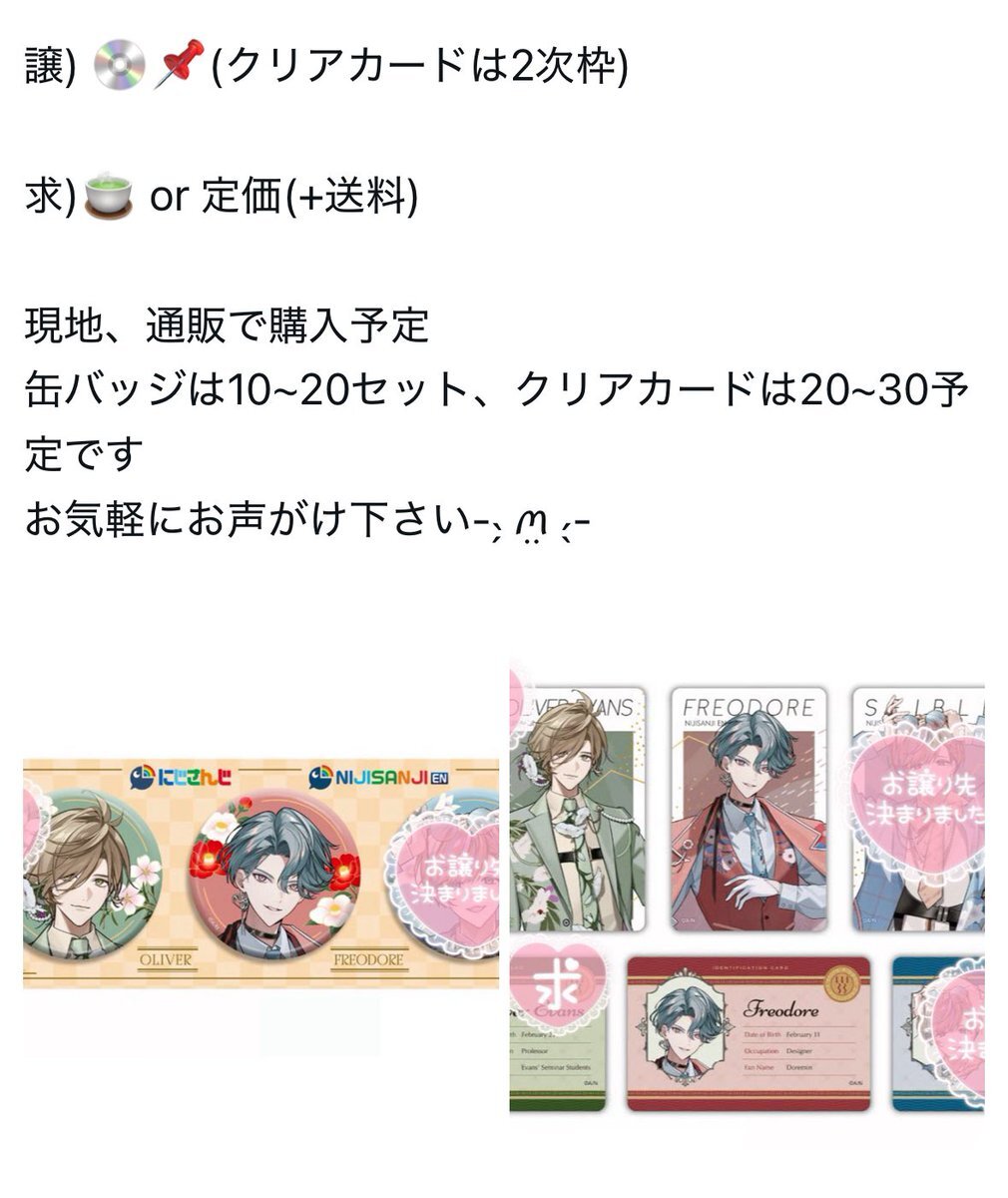 にじさんじ 日本百貨店 にじ日本百貨店 缶バッジ ランダム クリアカード 交換 買取 譲渡 譲:🍵様、👔様 求:💿📌様 缶バッジは1セット、クリアカードは20前後購入予定です。 ※別界隈にてお取引を300↑経験済ですが、こちらの界隈は初めてのため先送り対応〇 お気軽にお声かけください! pic.x.com/CmIFDA5xOK