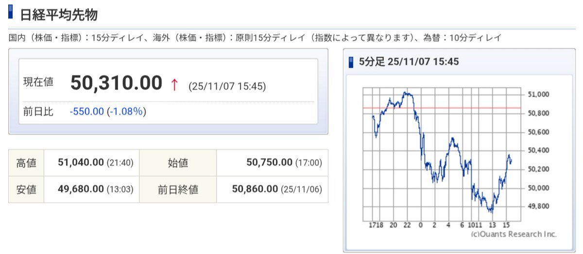 あらら 日経平均先物が下げ幅拡大中📉 週明けは50000円割りそうな感じですね😂 x.com/manibou1968/st…