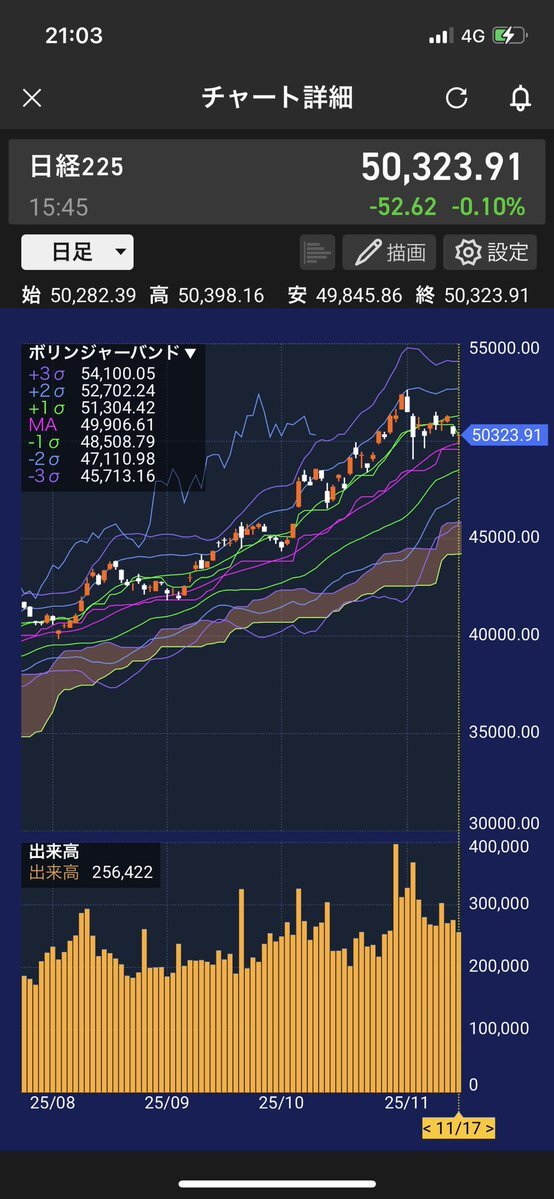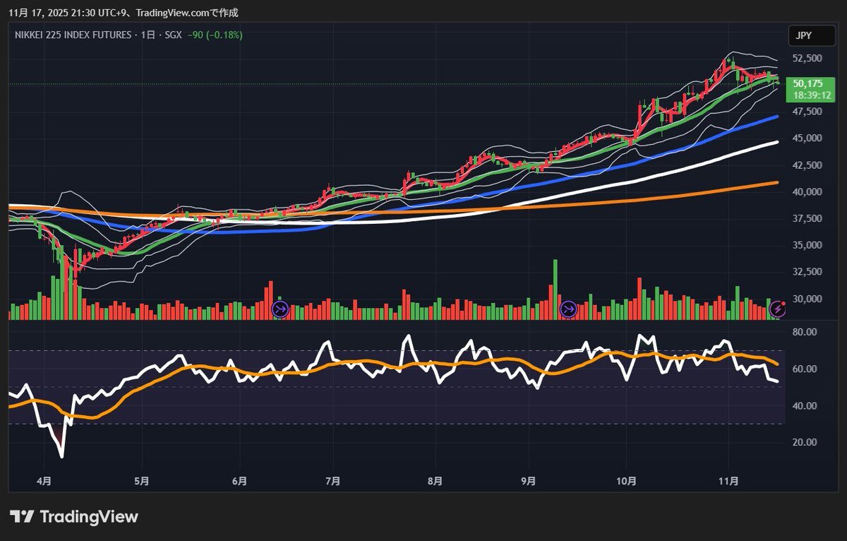 💹本日のトレード ありません 【11/17 相場概況】 日経平均株価は続落し、終値は前週末比52円62銭(0.10%)安の5万0323円91銭だった。下げ幅は500円を超え、節目の5万円を割り込む場面があった。 日中関係の悪化懸念からインバウンド(訪日外国人)関連株が軒並み売られた。 pic.x.com/xMrJFnknS4