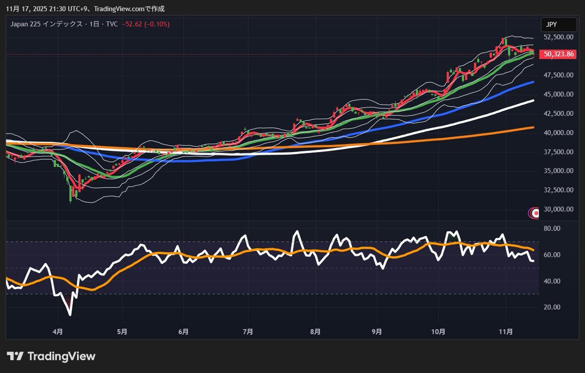 2025年11月17日(月)の日経平均株価 本日の終値は-52円の50,323円とほぼ変わらず📉 中国当局が中国国民に対し日本への渡航を控えるように注意喚起を行ったことから、インバウンド関連株への風当たりが強まった📈 国内の新発10年債利回りが17年半ぶりの高水準となり警戒する動きを助長した👀 pic.x.com/QJ5gIuOzc4