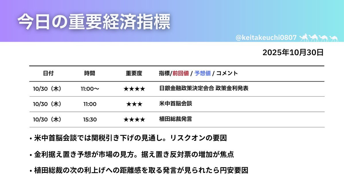 おはようございます☀ 10月30日は「イベント待ちの調整局面」が予想されますが、需給は底堅く、レンジ内での推移となりそう☝️ 🏛️ 注目イベント 🎃日銀金融政策決定会合 →利上げは見送りの見通し。植田総裁の発言に注目 🎃米FOMC(連邦公開市場委員会) →追加利下げの可能性あり pic.x.com/sXI6apTGHC