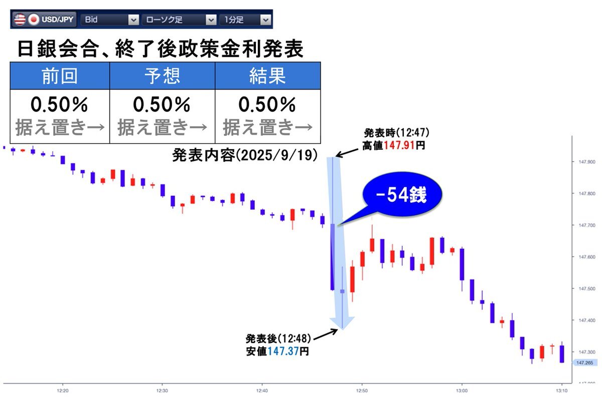【政策金利発表】 日銀金融政策決定会合、終了後政策金利発表 結果:0.50% 予想:0.50%で据え置き #FX #FXTF #日銀政策決定会合 #植田総裁