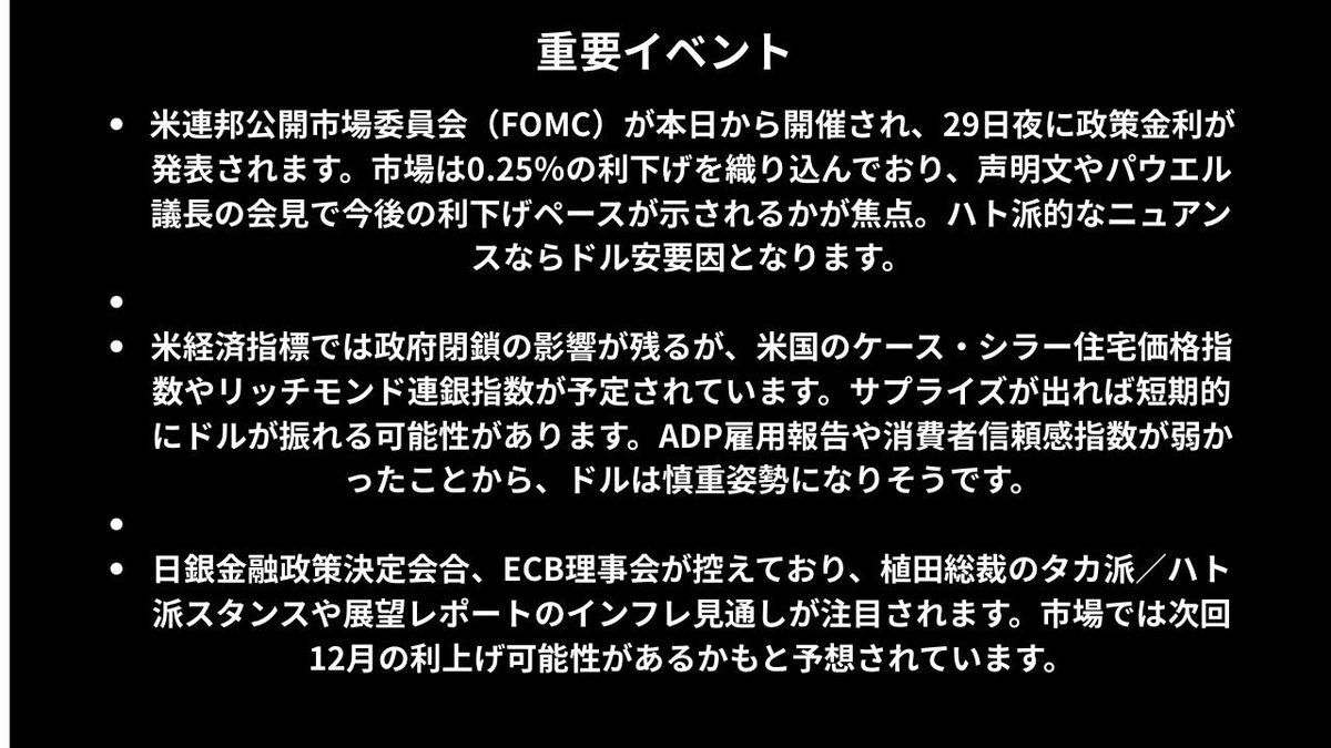 今後の重要イベント③ 日銀金融政策決定会合、ECB理事会が控えており、植田総裁のタカ派/ハト派スタンスや展望レポートのインフレ見通しに注目。市場では次回12月の利上げ可能性があるかもと予想。 #FX #FX初心者 #ファンダメンタルズ分析 #FX指標 #FXトレード pic.x.com/tXn3LbA4nY