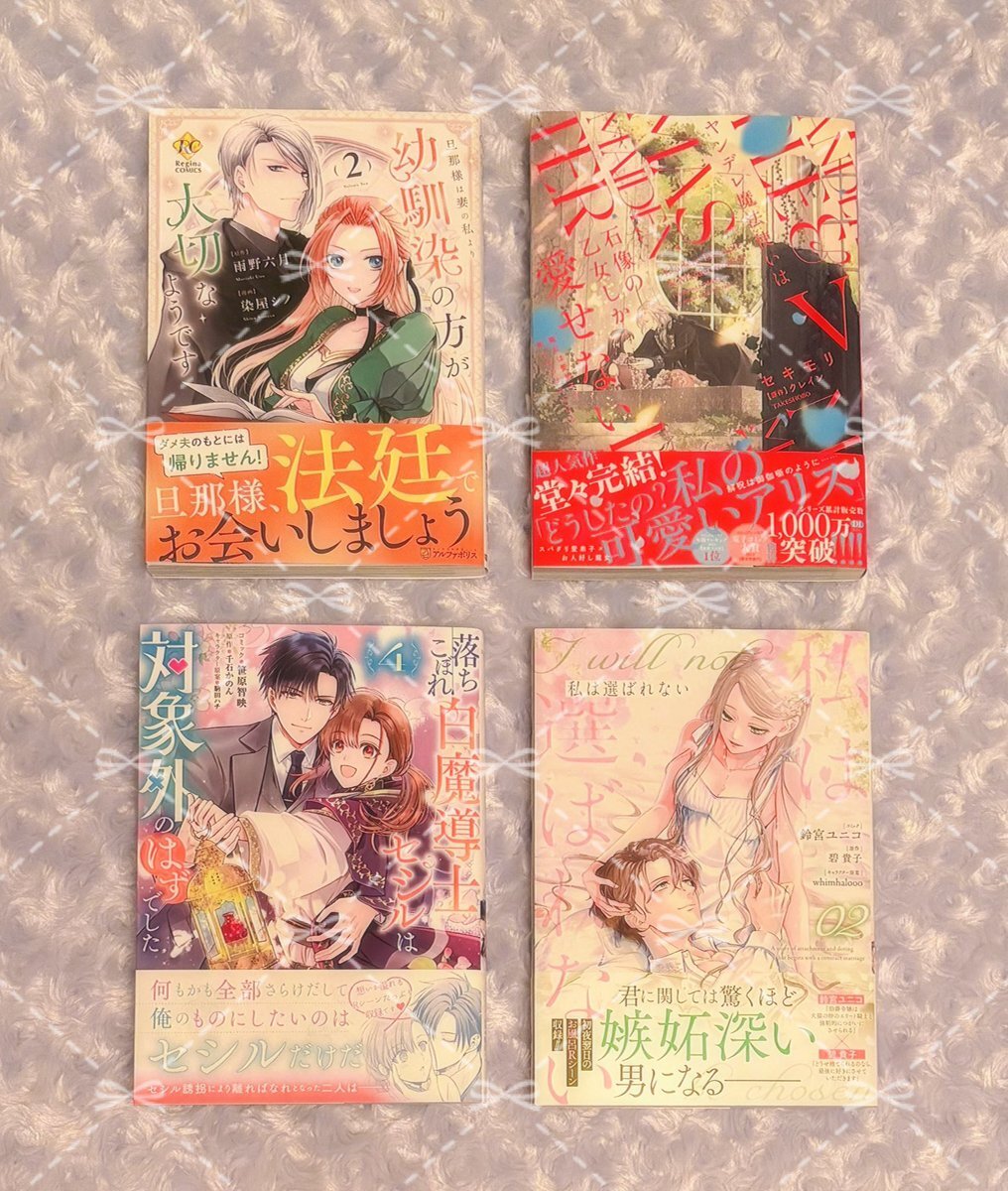 8月にお迎えした本📚💕 (コミックス編) 『旦那様は妻の私より幼馴染の方が大切なようです 2』 『私は選ばれない 2』 『落ちこぼれ白魔導士セシルは対象外のはずでした 4』 『ヤンデレ魔法使いは石像の乙女しか愛せない 魔女は愛弟子の熱い口づけでとける 5』 pic.x.com/nKEOneixKL