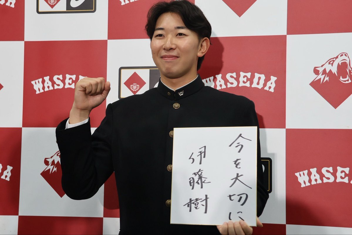伊藤樹 球団指名挨拶】 本日、プロ野球ドラフト会議にて東北楽天ゴールデンイーグルスより2位指名を受けました #伊藤樹 (4年・投・スポ・ #仙台育英) の球団指名挨拶が行われました。 プロの道へ進む伊藤へ、今後も温かいご声援をよろしくお願いいたします! #早稲田大学野球部 #wasedabbc pic.x.com/jnXOSzw6Sg