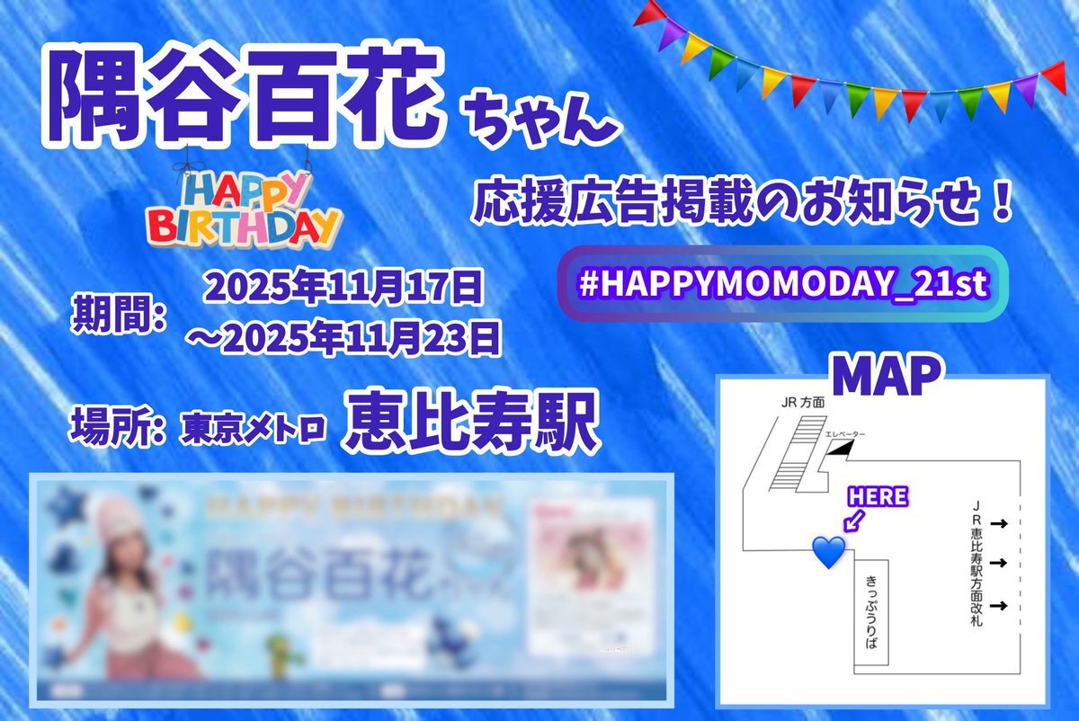 ⭐️応援広告掲載のお知らせ⭐️ #隅谷百花 ちゃんのお誕生日をお祝いして、広告を掲載します! 📍:東京メトロ恵比寿駅 🗓️:2025年11月17日〜11月23日 お立ち寄りの際は、 #HAPPYMOMODAY_21st をつけて投稿していただけると嬉しいです! 皆さんで百花ちゃんのお誕生日を盛り上げましょう💙🧟 #Girls2