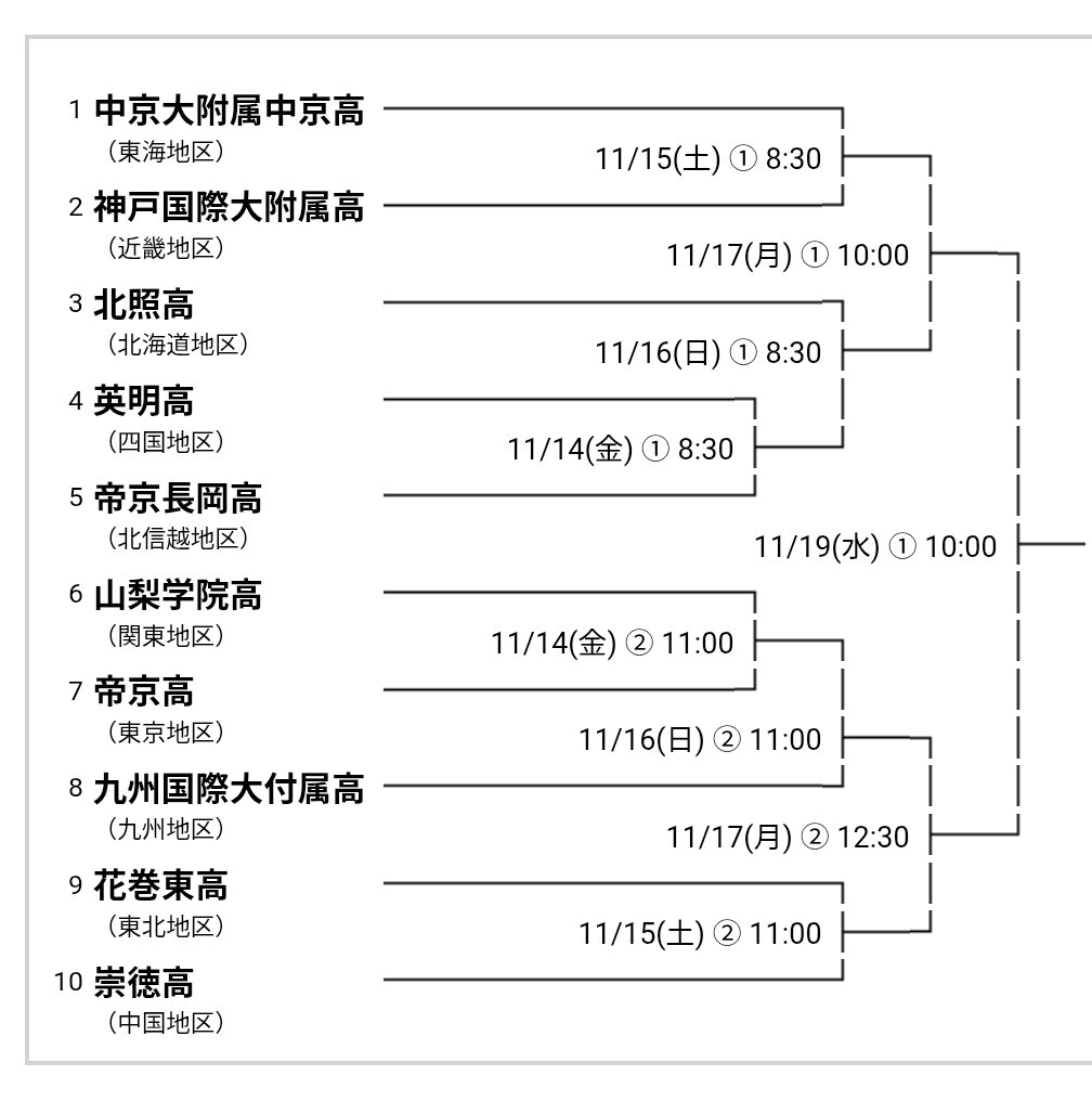 【明治神宮大会】 高校の部組み合わせ 11/14 ①四国代表−帝京長岡 ②関東代表−東京代表 11/15 ①東海代表−近畿代表 ②花巻東−中国代表 11/16 ①北照−〔四国代表−帝京長岡の勝者〕 ②〔関東代表−東京代表〕−九州代表
