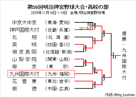 第56回明治神宮野球大会・高校の部 〈決勝〉 九州国際大付 300 004 022 11 神戸国際大付 100 000 000 1 九州国際大付が神戸国際大付に大勝し優勝しました🏆️✨ 九州勢の優勝は11大会ぶりです。 これで神宮枠は九州地区に! 恩恵を受けるのは沖縄尚学、小林西、長崎西あたりになりそう。 pic.x.com/5U4CMwE4Bx
