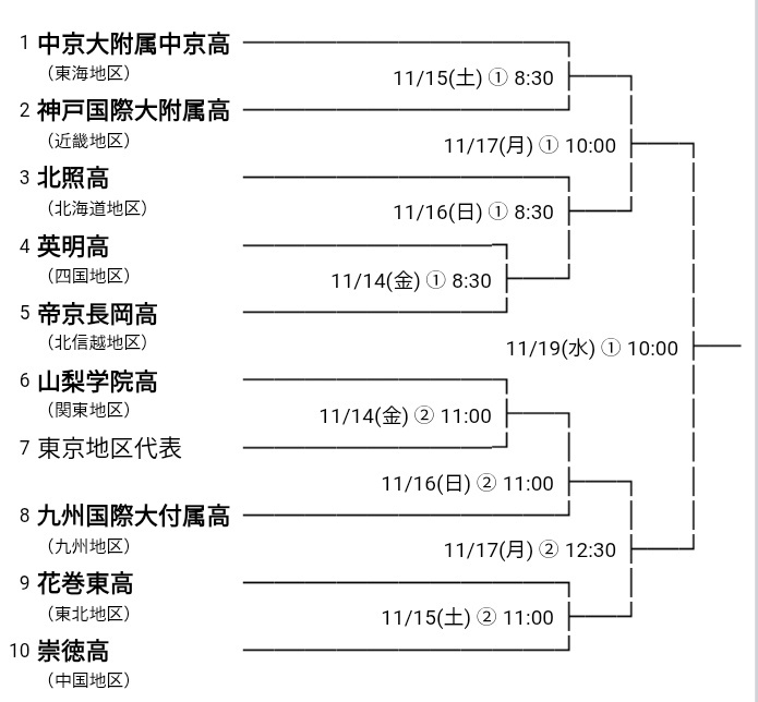 🍁⚾第56回明治神宮野球大会 📝高校の部 組み合わせ 🗓11月14日 第1日 1回戦 1⃣英明🆚帝京長岡 2️⃣山梨学院🆚帝京 🗓11月15日 第2日 2回戦 1⃣中京大中京🆚神戸国際大付 2️⃣花巻東🆚崇徳 🗓11月16日 第3日 2回戦 1⃣北照🆚14日1⃣の勝者 2️⃣14日2️⃣の勝者🆚九州国際大付 🗓11月17日 第4日 準決勝