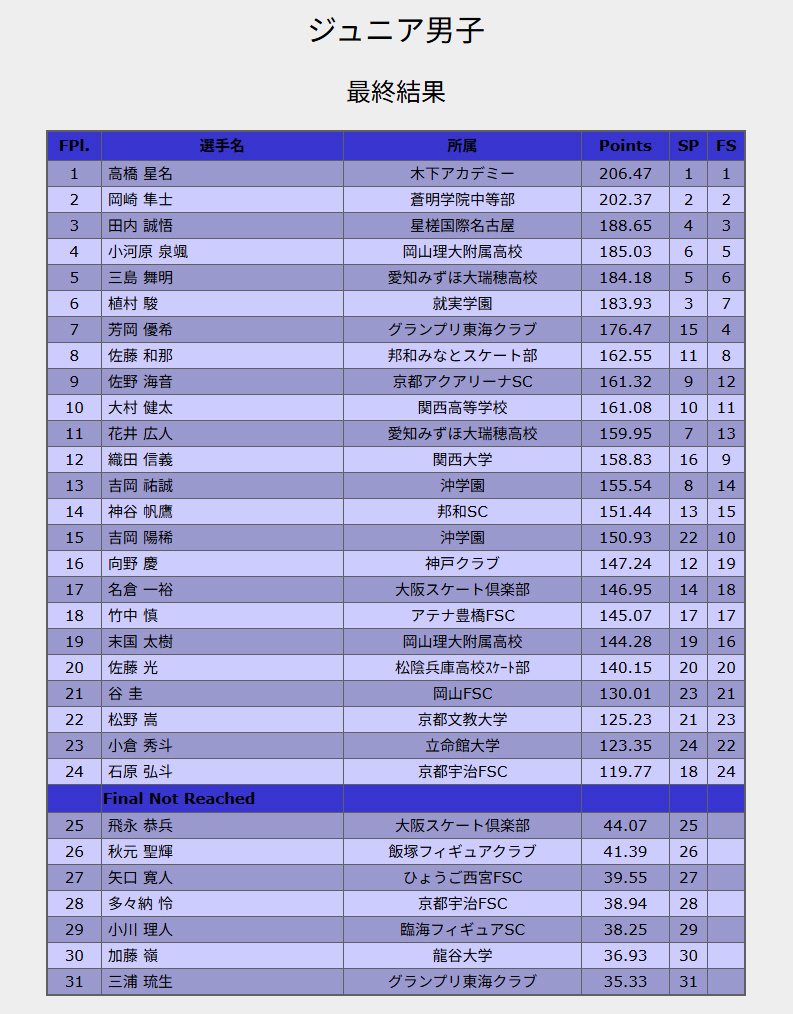 24.高橋星名くん(シード) ミッション 2S 3Lz(fall) 3A+2T CCSp ChSq 3A 3F+2A+2A+SEQ 3Lo+3T FSSp 3F CCoSp 136.32 206.47