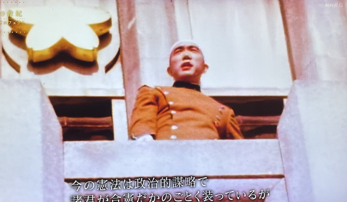 映像の世紀バタフライエフェクト 昭和の文豪たち 初回放送日NHK総合テレビジョン11月17日(月)午後10:00 web.nhk/tv/an/butterfl… >昭和45年11月25日、作家・三島由紀夫が自衛隊駐屯地に乱入、隊員に向けて憲法改正と決起を呼びかけた。それは文学者が国家に挑んだ前代未聞の出来事だった。