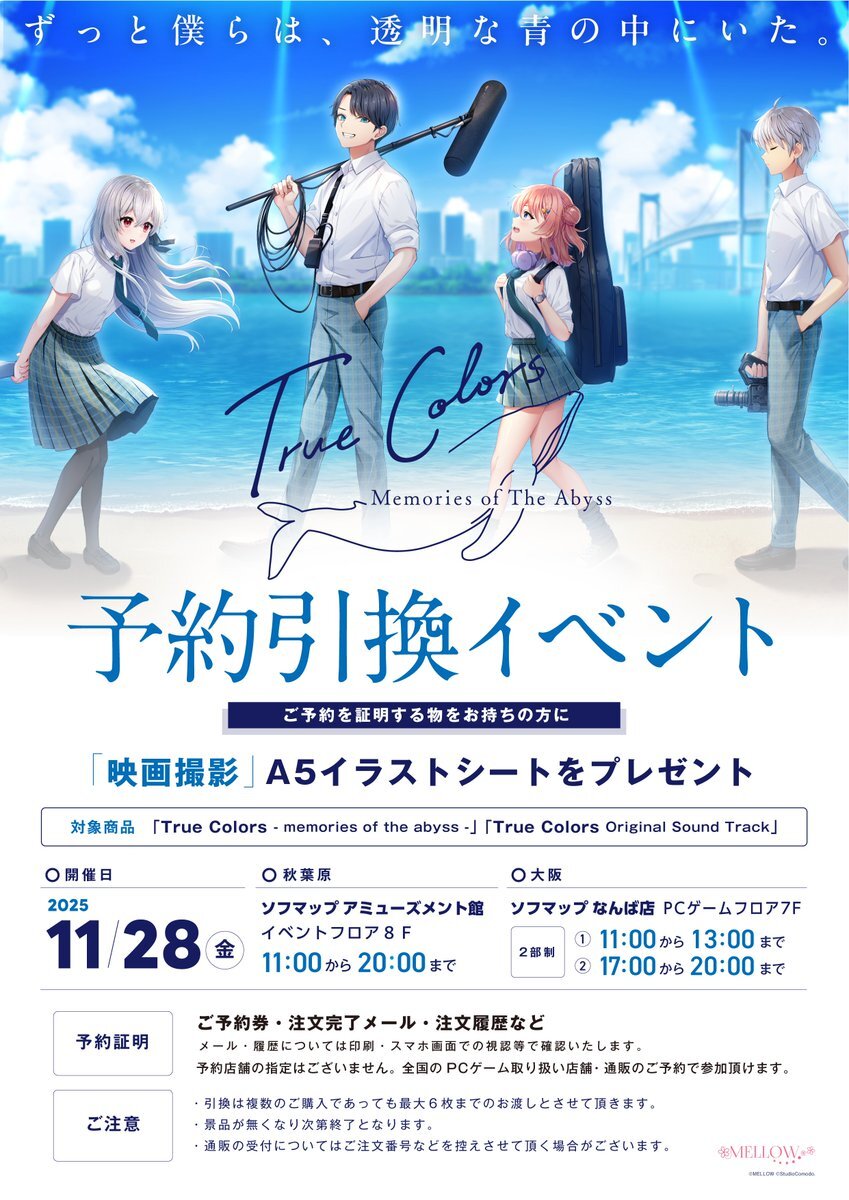【お知らせ】MELLOW新作「True Colors」の予約引換イベントの情報を公開しました! ゲーム及びサントラの予約者様が対象となります。 11月28日のイベントでは体験版で描かれる映画撮影のA5イラストシートがプレゼントされます。詳細はPOPをご確認ください! #TrueColors mellow-soft.com/true-colors/ pic.x.com/KSlIE7UfWc