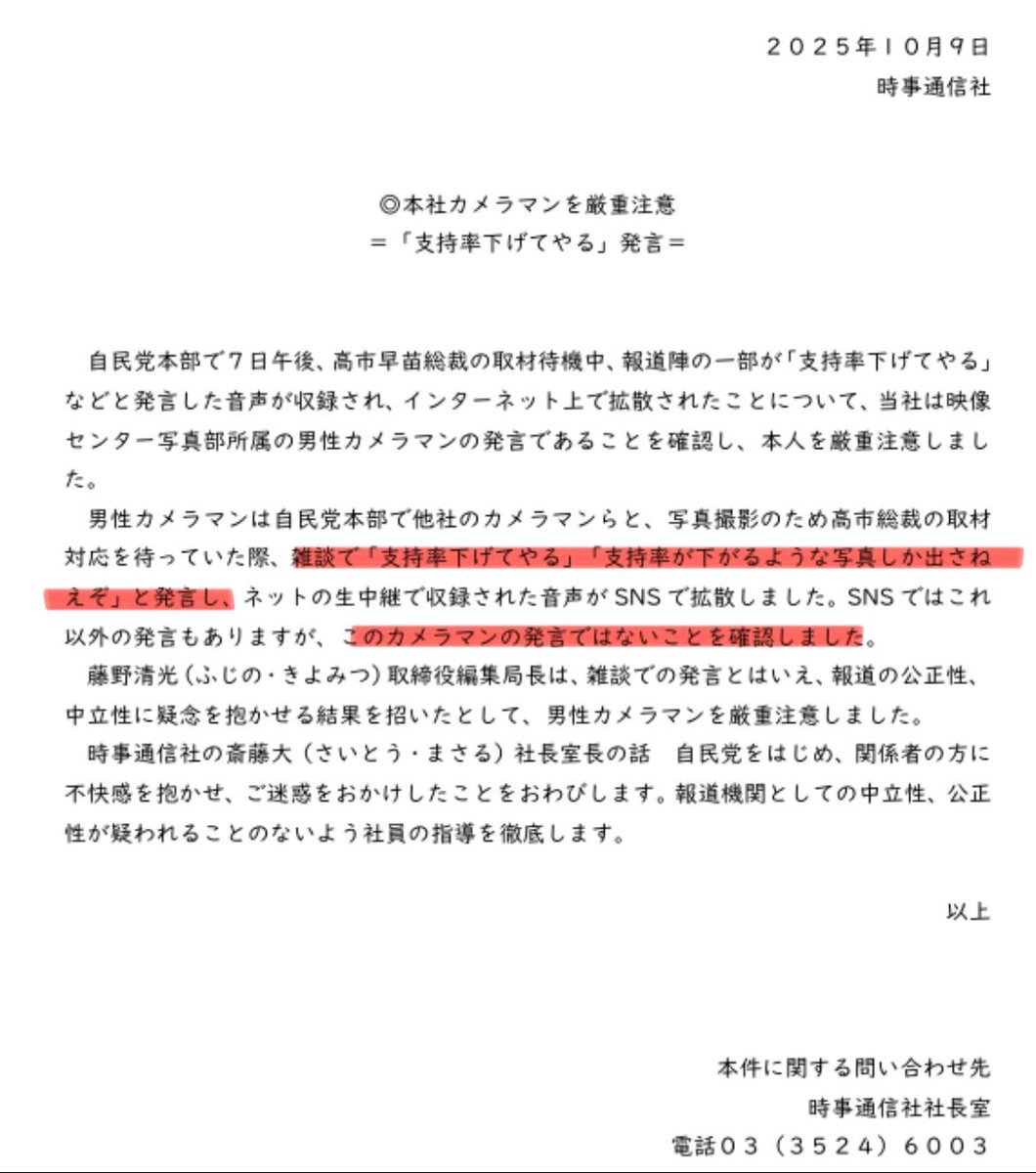 Sat.10.11.R7 高市新総裁 記者会見場 『支持率下げてやる』 暴言 報道の公平性を毀損する 重大事件 時事通信のカメラマン 同社は謝罪記事と厳重注意 処分が甘すぎる マスコミ関係者は準公人 実名公表は当然 『イヤホンで麻生さんの指示 裏金、靖国なんかでしょ』 この暴言の犯人探しも すべき
