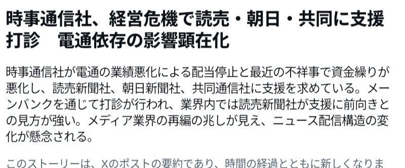 時事通信社経営危機で読売・朝日・共同に支援打診 電通無配が直撃 x.com/i/trending/198…