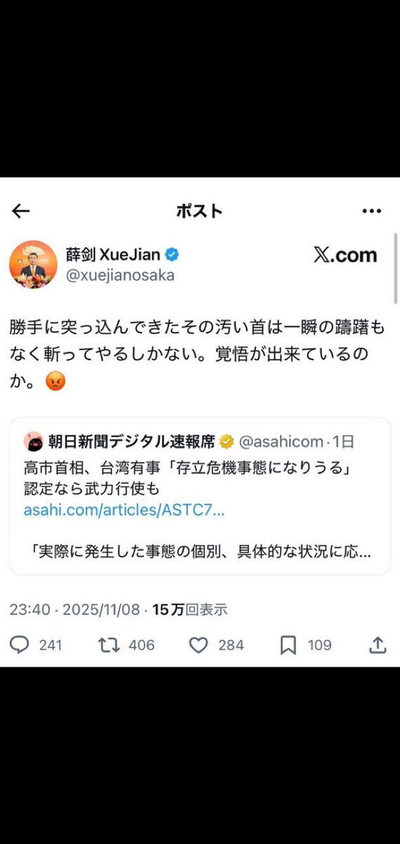 日本大使呼び抗議 首相の台湾有事発言で―中国- 時事通信社 #木原官房長官 も #駐中国日本大使 も #バカ総理高市 の #尻拭い を強いられ #中国へ平謝り中 #外交安全保障のイロハ さえ知らず #バカ信者 達へ幼稚なアピールを…米国との信頼関係をも毀損 正に #国賊 l.smartnews.com/m-6AcIKf16/DDB…