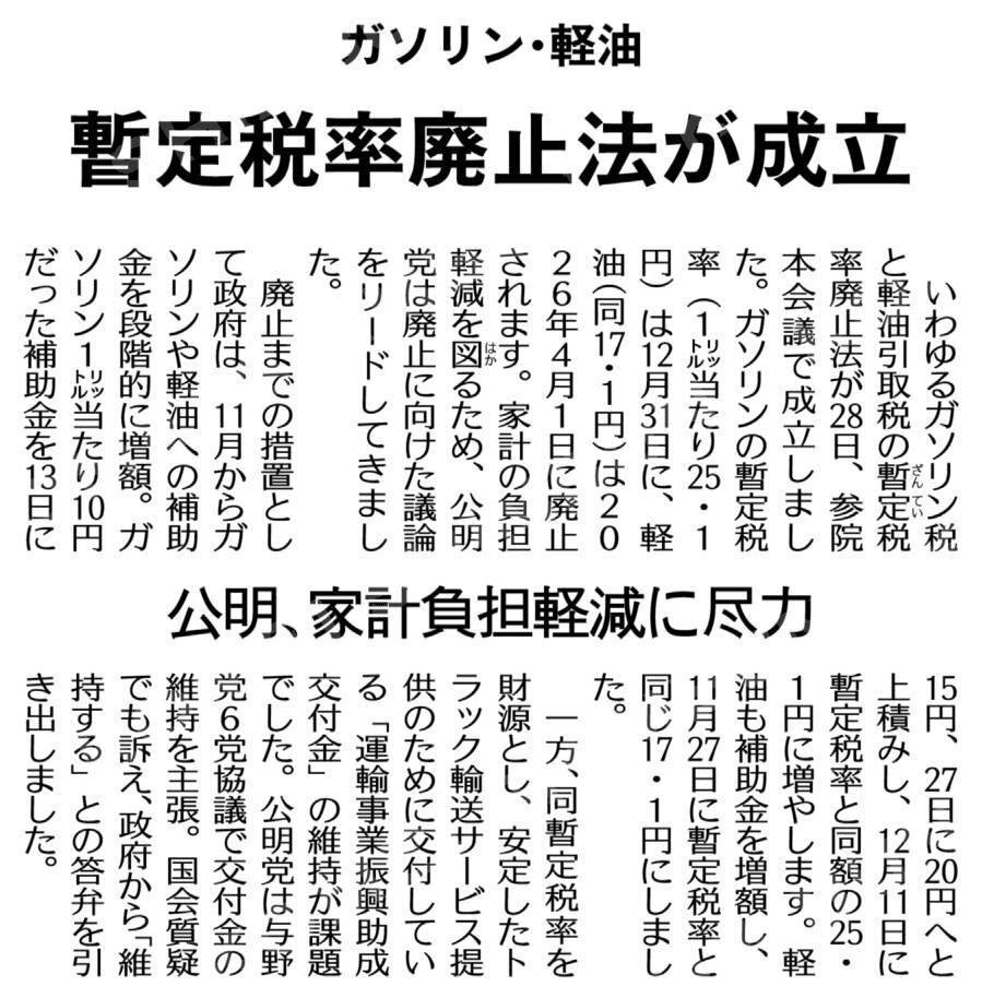 (ガソリン・軽油)暫定税率廃止法が成立/公明、家計負担軽減に尽力 #公明新聞電子版 2025年11月30日付 komei.or.jp/newspaper-app/ pic.x.com/l75SAiSdIq