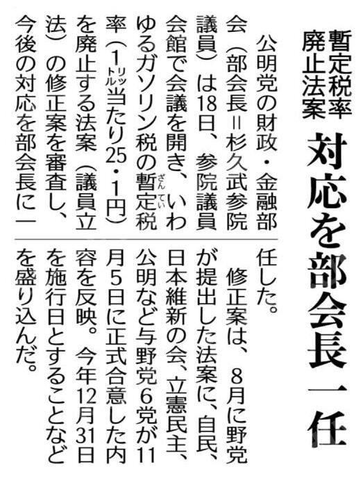 暫定税率廃止法案)対応を部会長一任 #公明新聞電子版 2025年11月19日付 komei.or.jp/newspaper-app/ pic.x.com/H4UWoY1b2L