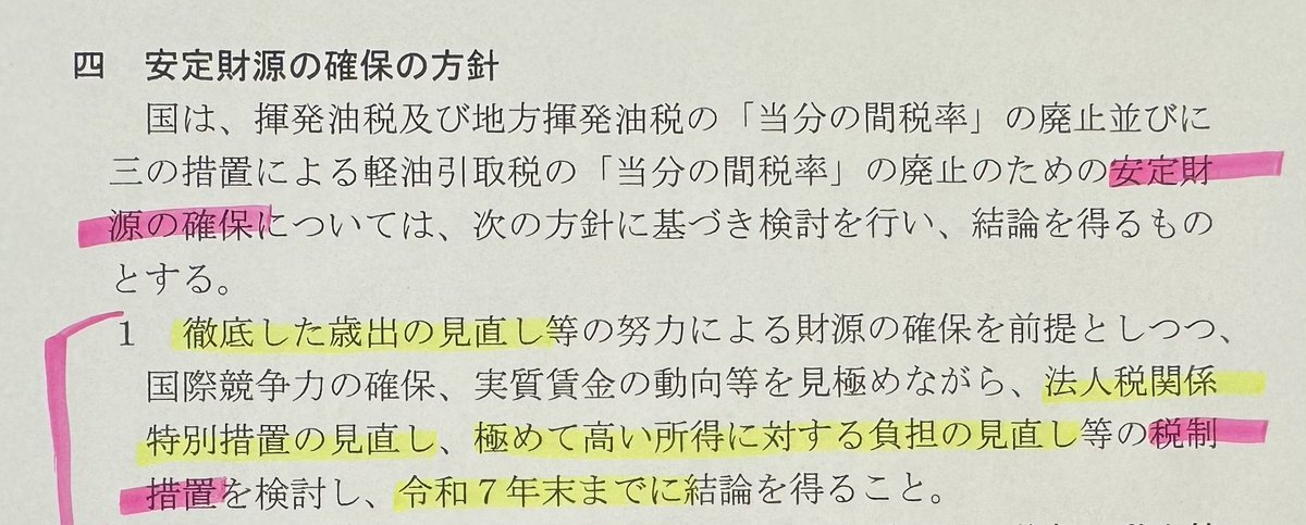 ガソリン減税(暫定税率廃止法案に自民党の要求で加えられた「財源」条項。 自民党はまだ「代替増税」を諦めていない。 野党は自維政権に「徹底した歳出の見直し」を求め、押し返し切らないといけない。 玉木氏や榛葉氏のように「高市総理、有難うございます」などと礼を言っている場合ではない。 pic.x.com/FD2FXeUZQs