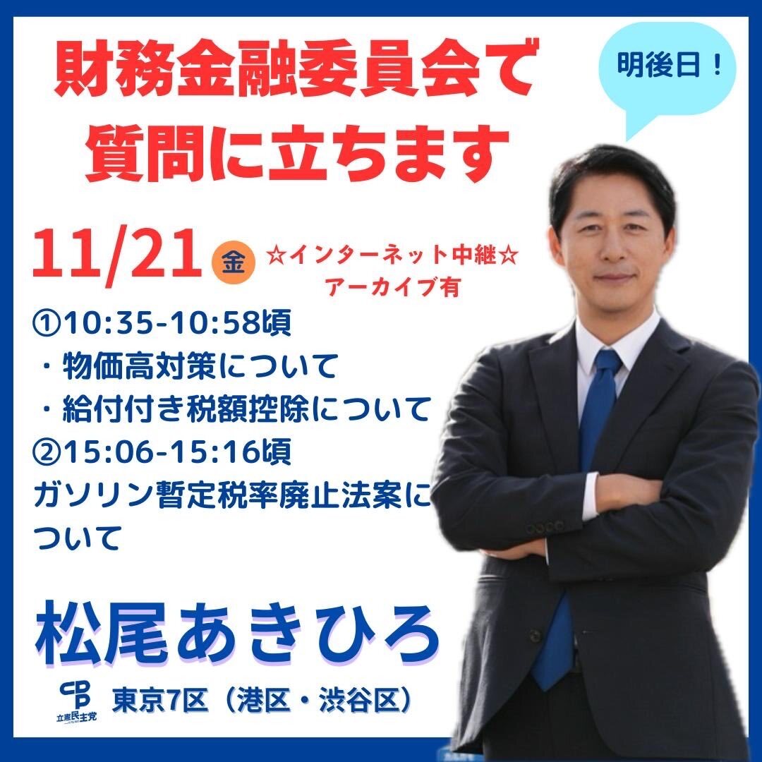 ⭐️今国会初質問に立ちます!⭐️ 【財務金融委員会11月21日(金)】 ①10:35-10:58頃 ・物価高対策について ・給付付き税額控除について ②15:06-15:16頃 ガソリン暫定税率廃止法案について 📹ネット中継&アーカイブ有り shugiintv.go.jp/jp/ 「財務委員会」を選択してください。 #松尾あきひろ pic.x.com/fIdsZGwF9Z
