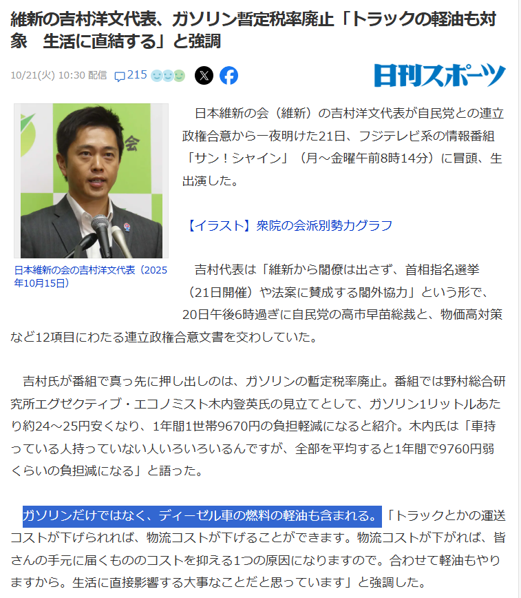 野党7党共同で提出の暫定税率廃止法案(軽油は対象外)が常会で廃案、その後8月の臨時会にも同様の法案が複数の野党から共同で提出されたらしいがどうなったのかよくわからじ。先月からの臨時会で与野党6党合意の時点では軽油も含む?