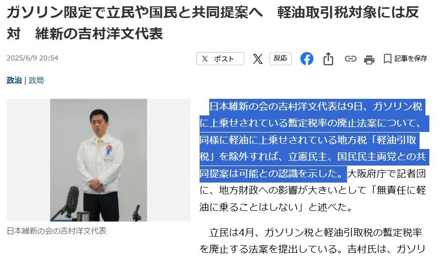 返信先:@hiroyoshimura維新の吉村洋文代表、ガソリン暫定税率廃止「トラックの軽油も対象 生活に直結する」と強調 野党提出のガソリン暫定税率廃止法案から軽油を除外したのは吉村洋文その人です 大阪府知事と日本維新の会代表、利益相反に支離滅裂な動き(呆れ こんないい加減な男いらないでしょ #ダブスタ維新の会 pic.x.com/wSOJqaABvx