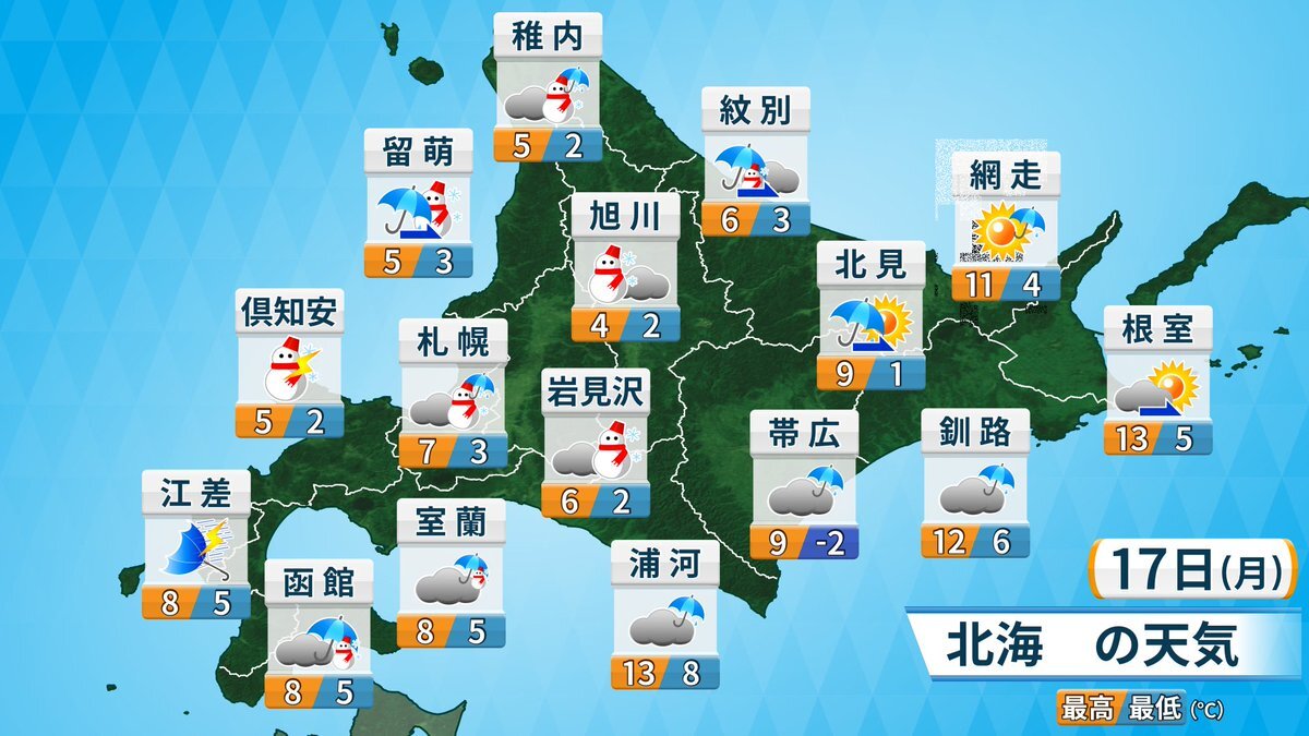 【あす(月)の天気】 未明〜昼前にかけて各地で雨☔ 道北沿岸は明け方まで警報級の暴風に🚨 朝は丈夫な傘を持って出かけて🌂 日中は次第に雪に変わり、夜にかけて 道南も含めて、広く積雪状態に☃️ 沿岸では吹雪によるホワイトアウトも⚠️ 最高気温は札幌7℃、旭川4℃ですが 日中の気温は右肩下がり⤵️