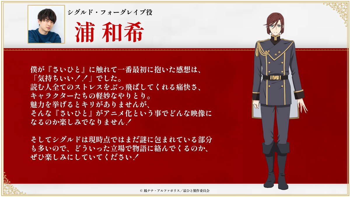 ━━━━━━━━━━━ 最後にひとつだけ お願いしても よろしいでしょうか ━━━━━━━━━━━ キャラビジュアル&キャスト解禁! 浦さんからのコメントも到着💬✨ ▌シグルド・フォーグレイブ CV: #浦和希 ❐2025年秋放送 saihito-anime.com #さいひと pic.x.com/4kBsb4q5fh