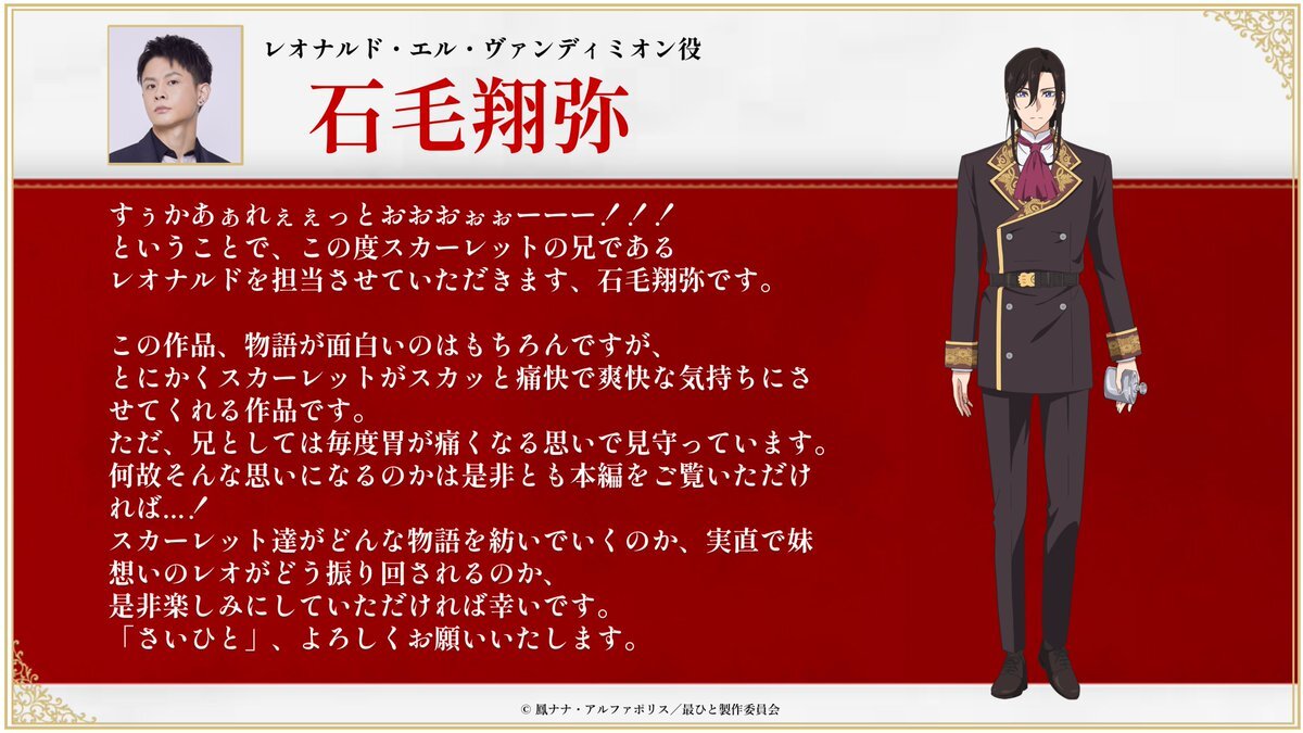 ━━━━━━━━━━━ 最後にひとつだけ お願いしても よろしいでしょうか ━━━━━━━━━━━ キャラビジュアル&キャスト解禁! 石毛さんからのコメントも到着💬✨ ▌レオナルド・エル・ヴァンディミオン CV: #石毛翔弥 ❐2025年秋放送 saihito-anime.com #さいひと pic.x.com/w4MUTFihek