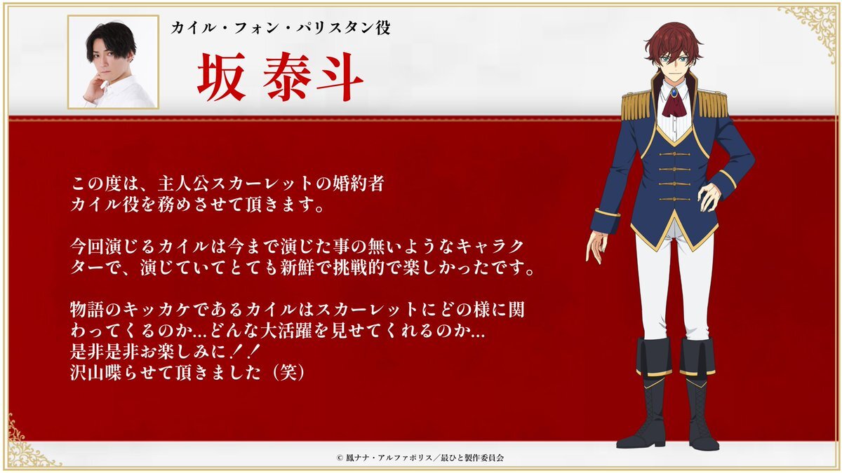 ━━━━━━━━━━━ 最後にひとつだけ お願いしても よろしいでしょうか ━━━━━━━━━━━ キャラビジュアル&キャスト解禁! 坂さんからのコメントも到着💬✨ ▌カイル・フォン・パリスタン CV: #坂泰斗 ❐2025年秋放送 saihito-anime.com #さいひと pic.x.com/6ZpSrQt5j1