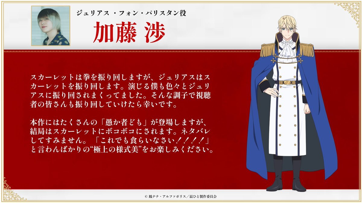 ━━━━━━━━━━━ 最後にひとつだけ お願いしても よろしいでしょうか ━━━━━━━━━━━ キャラビジュアル&キャスト解禁! 加藤さんからのコメントも到着💬✨ ▌ジュリアス ・フォン・パリスタン CV: #加藤渉 ❐2025年秋放送 saihito-anime.com #さいひと pic.x.com/T4kF6jYO7v