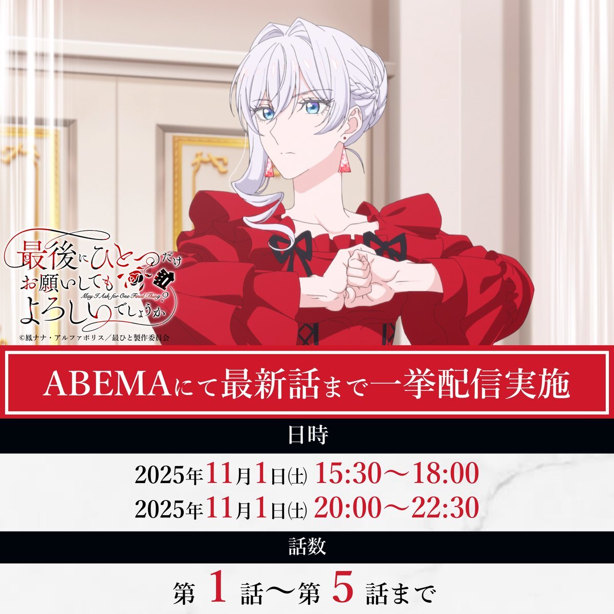 🌹✧✦ #さいひと ABEMA一挙配信 ✦✧🌹 #ABEMA にて、TVアニメ『#最後にひとつだけお願いしてもよろしいでしょうか』最新第5話まで一挙配信実施✨ ✦配信URL 11/01㈯15:30~ abema.tv/channels/abema… 11/01㈯20:00~ abema.tv/channels/abema… pic.x.com/Vskn7Z5u0b