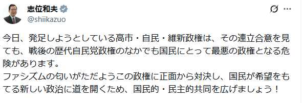 自民・維新連立の高市政権が誕生しました。 「戦後の政権の中で最悪の政権になりうる。日本共産党は断固として対決する」、これが新政権への日本共産党の立場です。 自民と維新の政策合意は、あまりにもひどい内容で、まるで暗黒政治への宣言をしているよう。