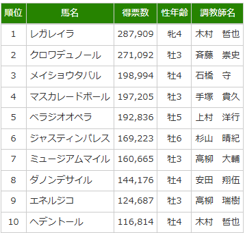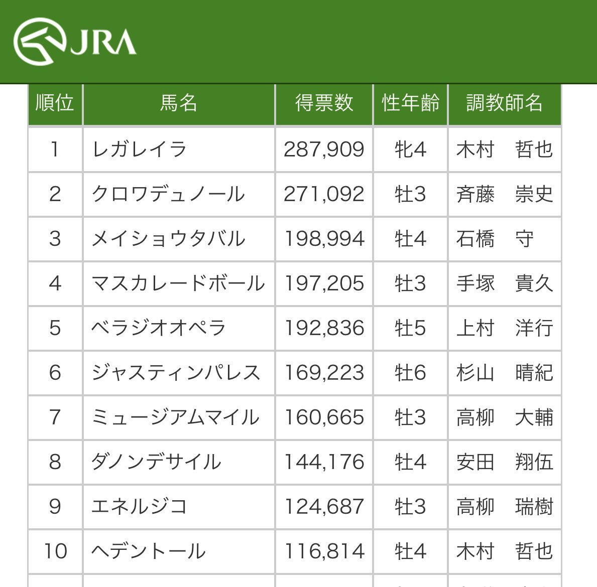 🐴有馬記念ファン投票 第1回中間発表‼️ 1⃣レガレイラ 牝4 2⃣クロワデュノール 牡3 3⃣メイショウタバル 牡4 4⃣マスカレードボール 牡3 5⃣ベラジオオペラ 牡5 6⃣ジャスティンパレス 牡6 7⃣ミュージアムマイル 牡3 8⃣ダノンデサイル 牡4 9⃣エネルジコ 牡3 🔟ヘデントール 牡4 pic.x.com/Zuv5uh1dCh